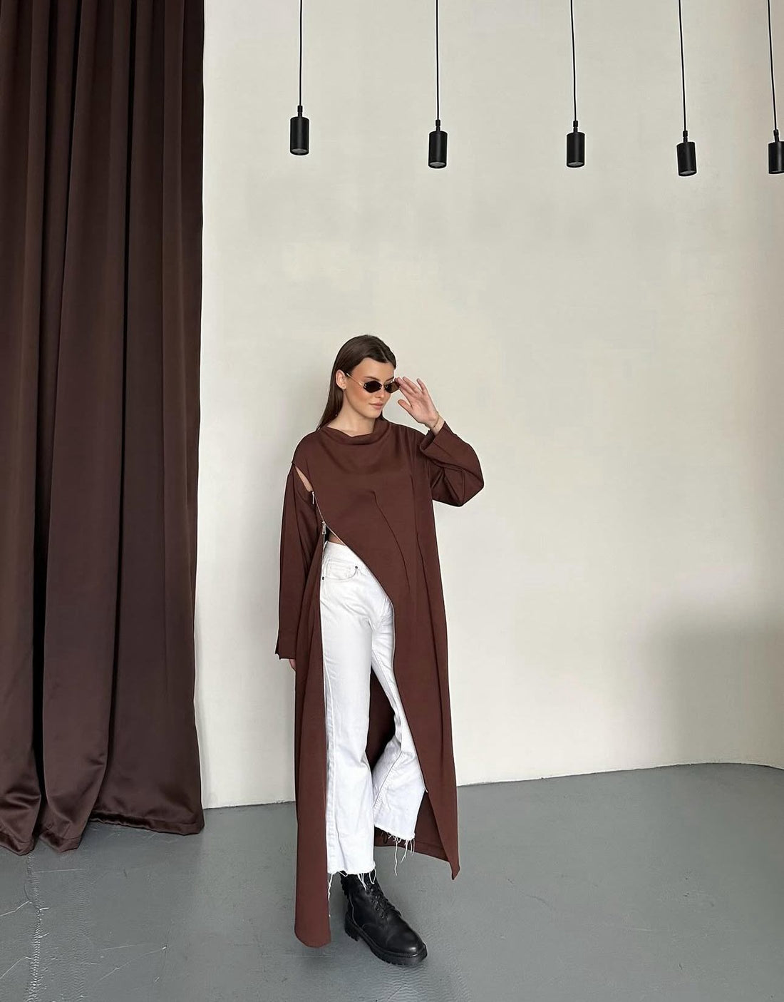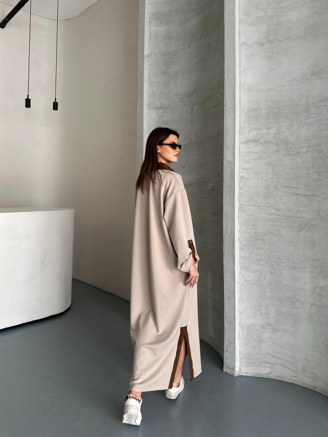 Robe Chemise Longue Marron à Imprimé Doré Avec Ceinture et Poches