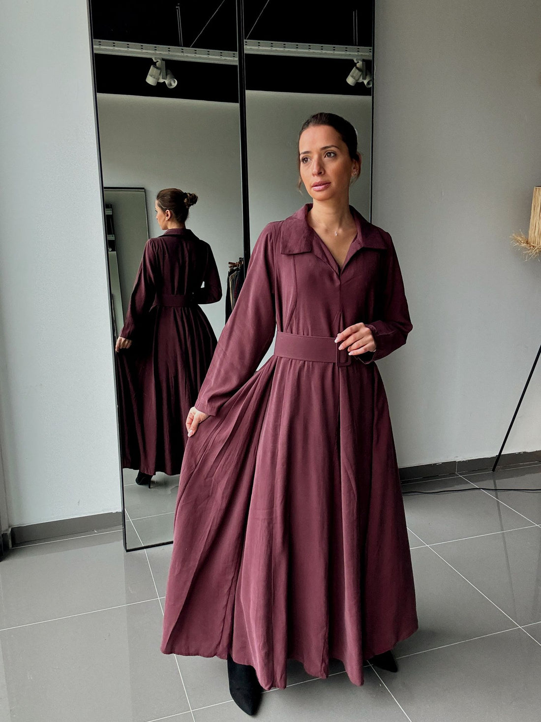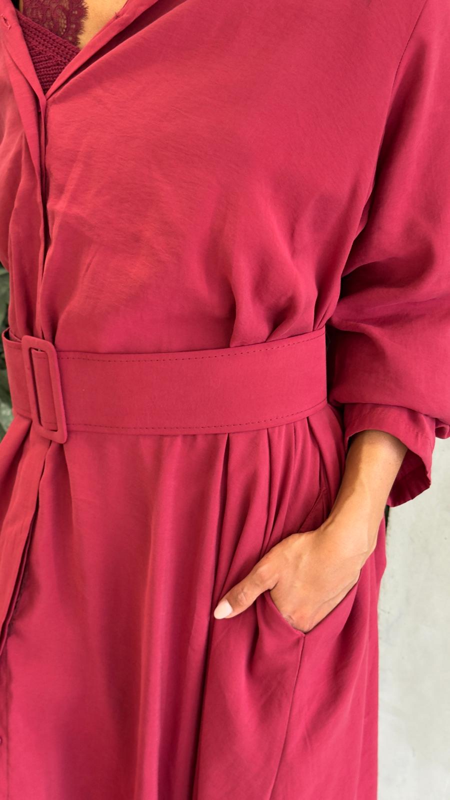 Robe Chemise Longue Bordeaux Avec Ceinture et Poches